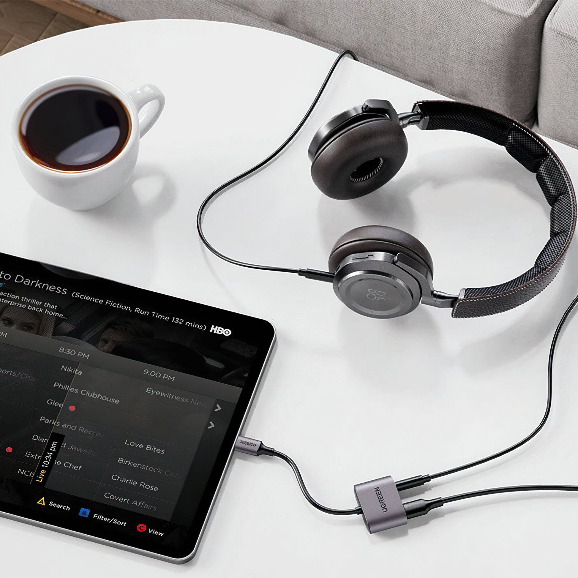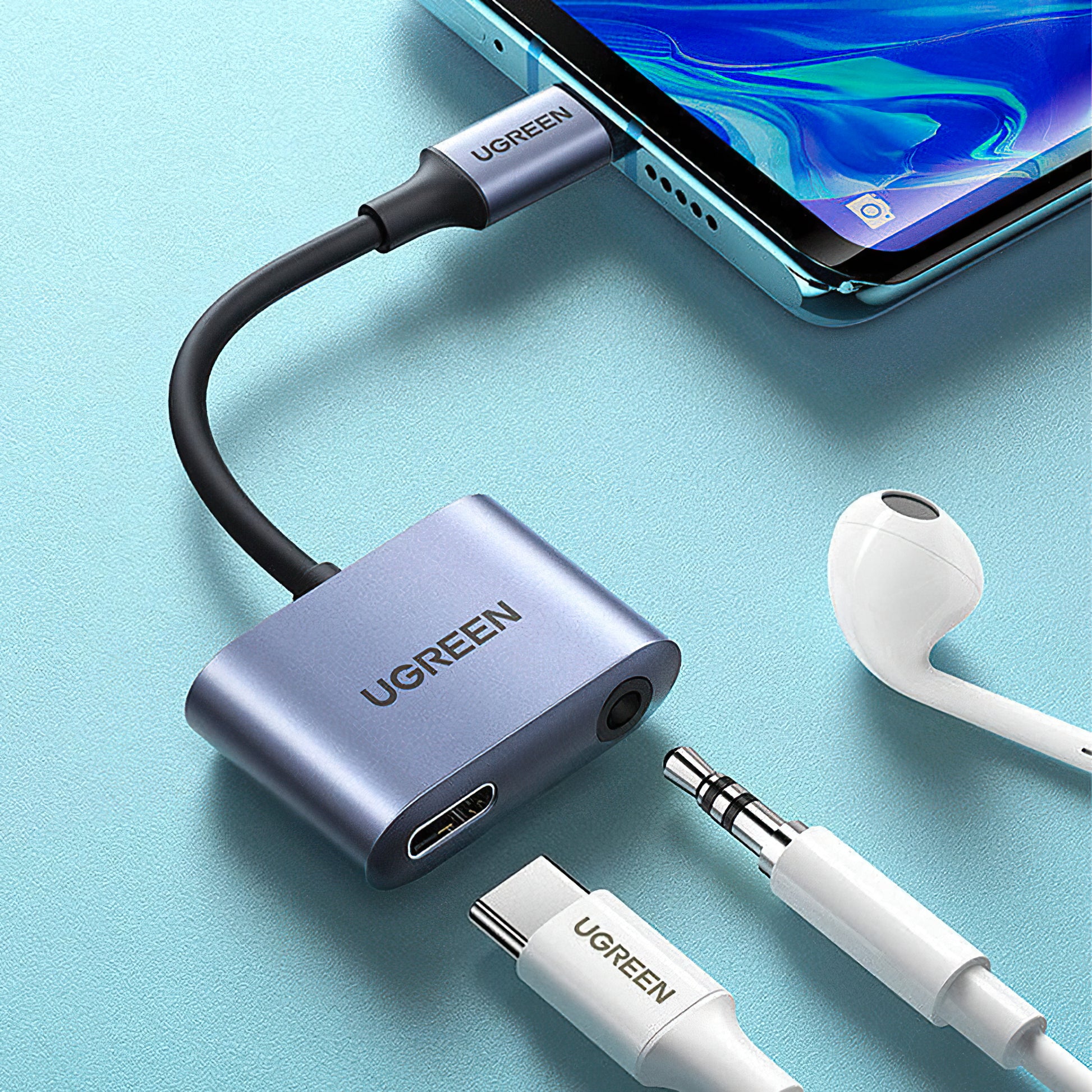 Der Audioadapter USB-C zu 3.5mm / USB-C UGREEN CM231 ermöglicht es dir, Musik zu hören und gleichzeitig dein Telefon zu laden.