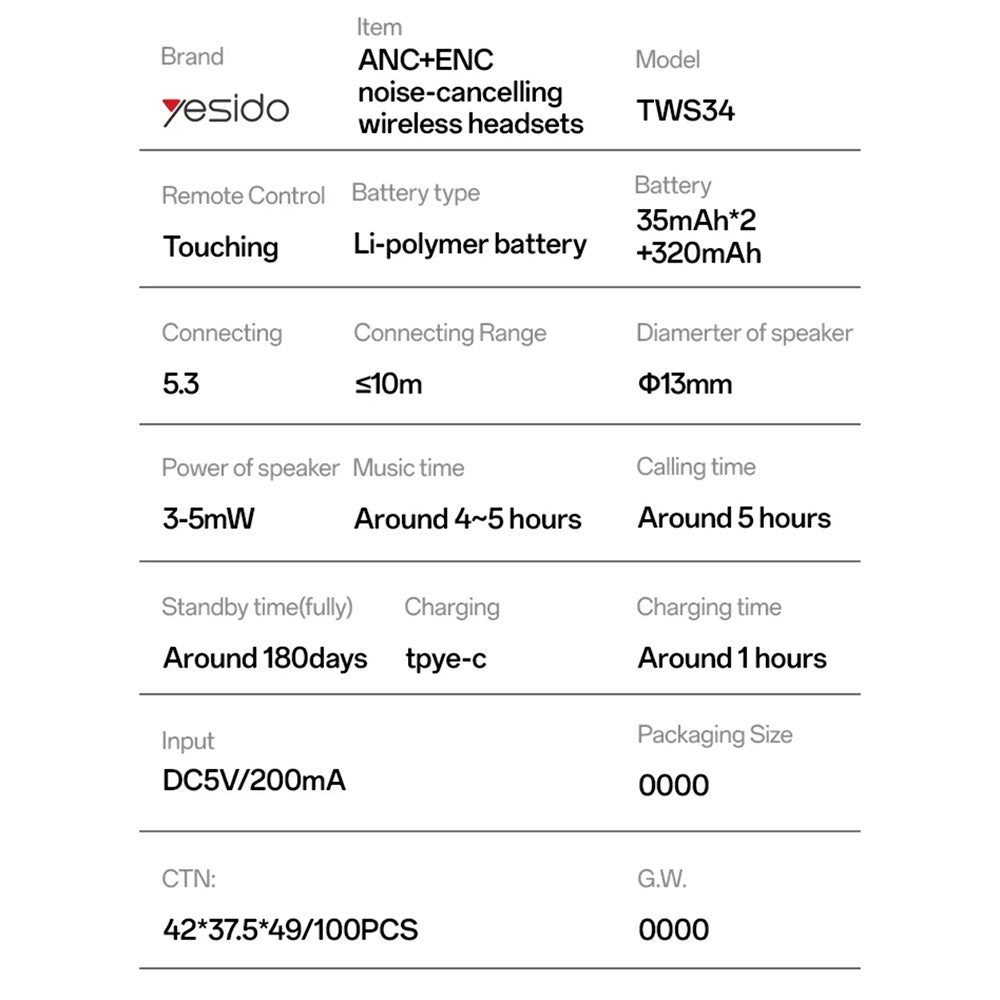 Handsfree Bluetooth Yesido TWS34, TWS, ANC, Weiß