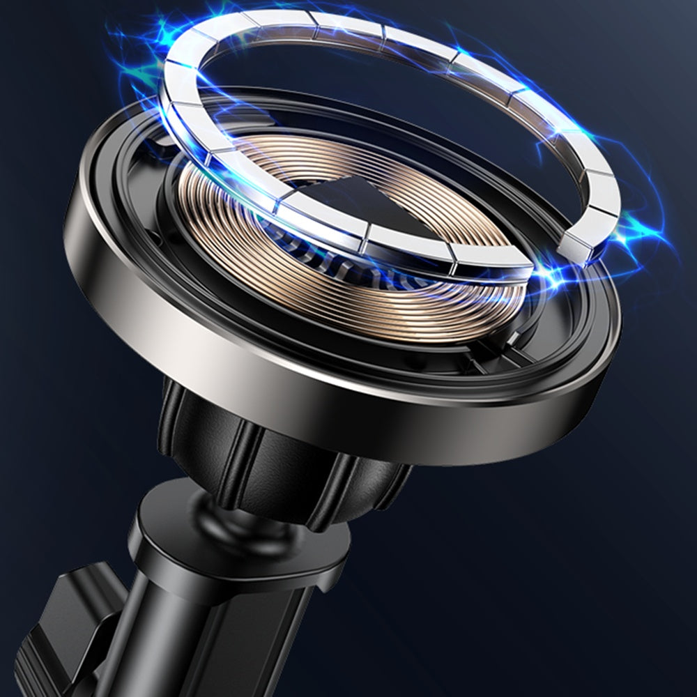 Autohalterung mit stabiler Befestigung, vollständige 360-Grad-Drehung und abnehmbares magnetisches Panel, das auch als drahtloses Büroladegerät verwendet werden kann.