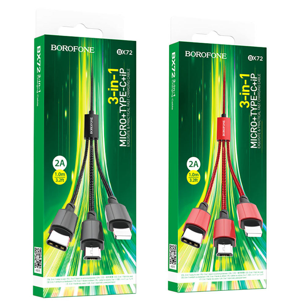 Borofone BX72 ist das ideale 3-in-1-Kabel für Benutzer, die mehrere Geräte besitzen und eine einfache und effiziente Lösung suchen. Ausgestattet mit drei Anschlüssen - USB-C,
