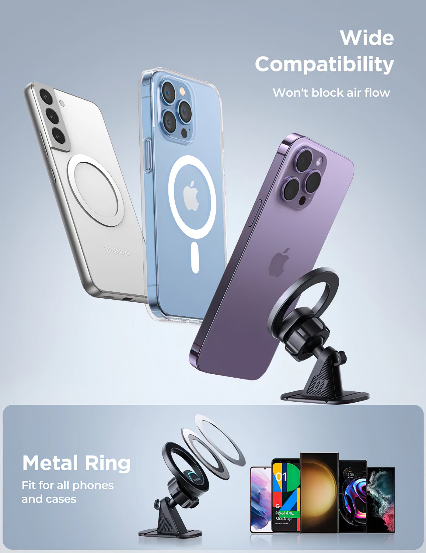wenn dein Telefon keine eingebauten Magnete hat, verwende einfach den mitgelieferten Metallring.