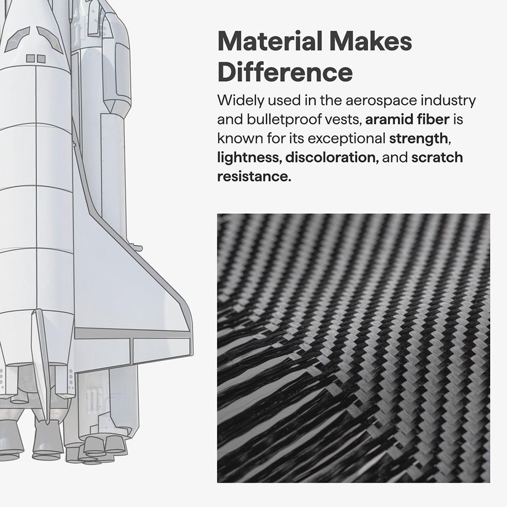 • Der subtil erhöhte Rahmen in Kombination mit der für ihre überlegene Festigkeit bekannten Aramidfaser sind wertvolle Vorteile gegen Beschädigungen.