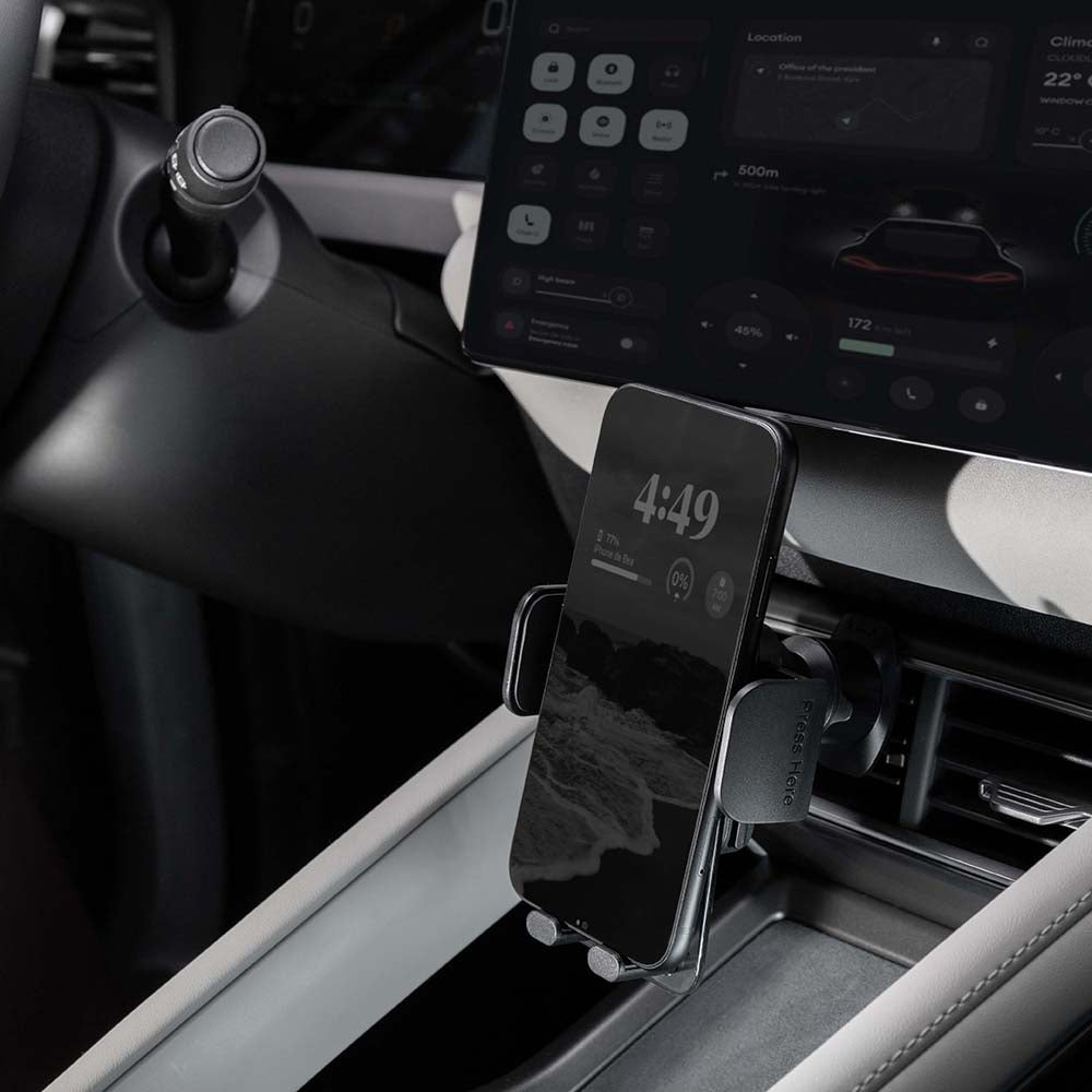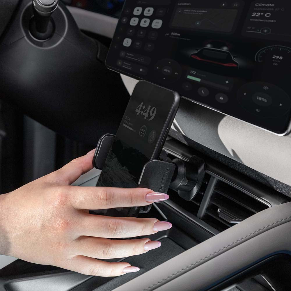 Vergiss die Halterungen, die deine Sicht im Verkehr einschränken! Wähle eine Premium-Autohalterung mit Befestigung am Lüftungsgitter. Sie lässt sich leicht montieren und bleibt während der gesamten Fahrt stabil.