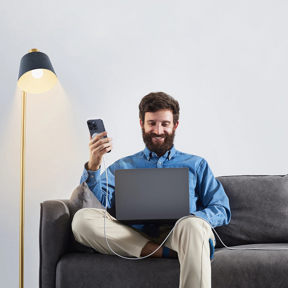 ohne zusätzliche Kabel. Es ist mit einem integrierten 1,5 Meter langen USB-C-Kabel ausgestattet, das textilgeschützt gegen Abnutzung und Verwicklungen ist.