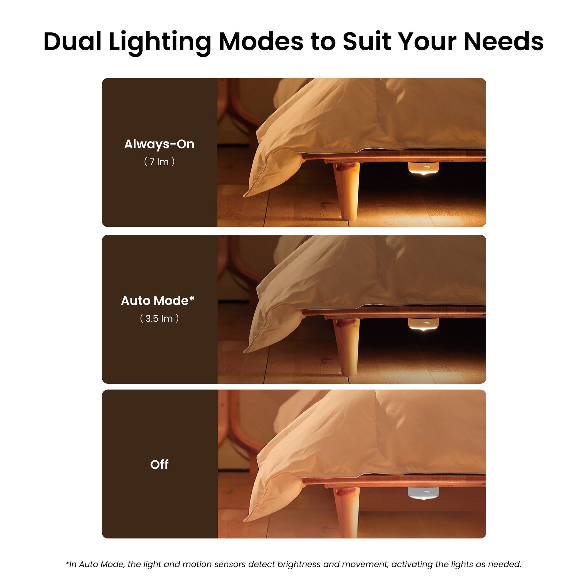 - Doppelte Beleuchtungsmodi: Auto-Modus: Aktiviert das Licht automatisch mit 3.5lm, wenn Bewegung erkannt wird