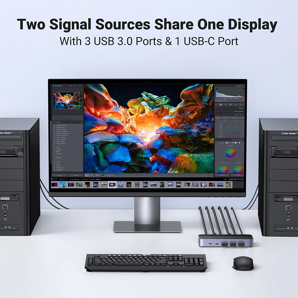 Augmentez votre efficacité et optimisez votre espace de travail avec UGREEN CM664, un switch vidéo KVM multifonctionnel qui vous permet de contrôler deux ordinateurs simultanément