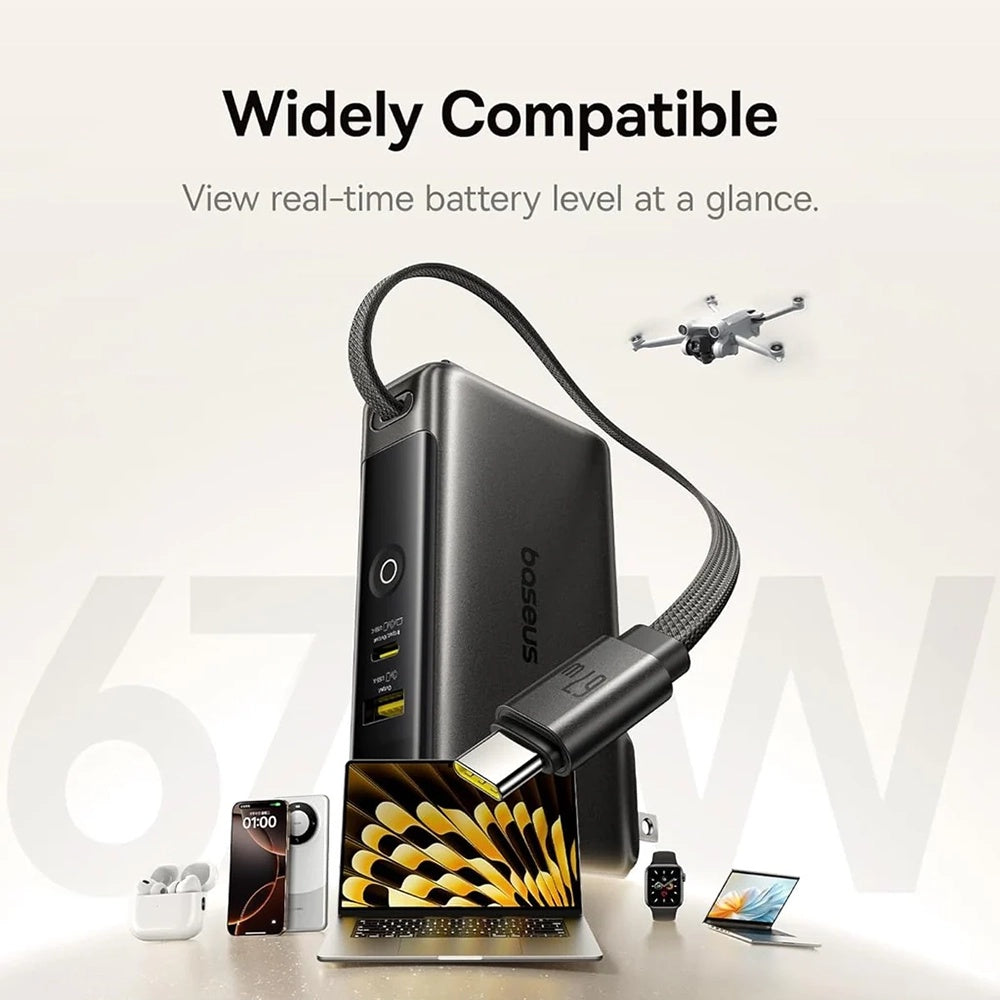 Stay connected all day! With an external battery and a 3-in-1 socket charger, you can quickly charge your phone, headphones, or tablet in a blink of an eye. External battery + power bank Don't run out of battery when you need it most! With this 10000mAh power bank, you can charge your phone multiple times, wherever you are - perfect for vacations, trips, or busy days. Ultra-fast charging With this battery, your phone charges much faster! The 67W power allows you to save time and have your smartphone ready when you need it. Specifications: Materials: ABS, polycarbonate; Connectors: USB-C, USB, Type-C cable; Socket charger mode power: 67W; External battery mode power: 35W; Battery capacity: 10000mAh; Output current: 5V/3A; Compatible protocols: PD, QC, SCP, PPS; Digital display: yes; Dimensions: 109 x 58 x 28mm; Weight: 299g.